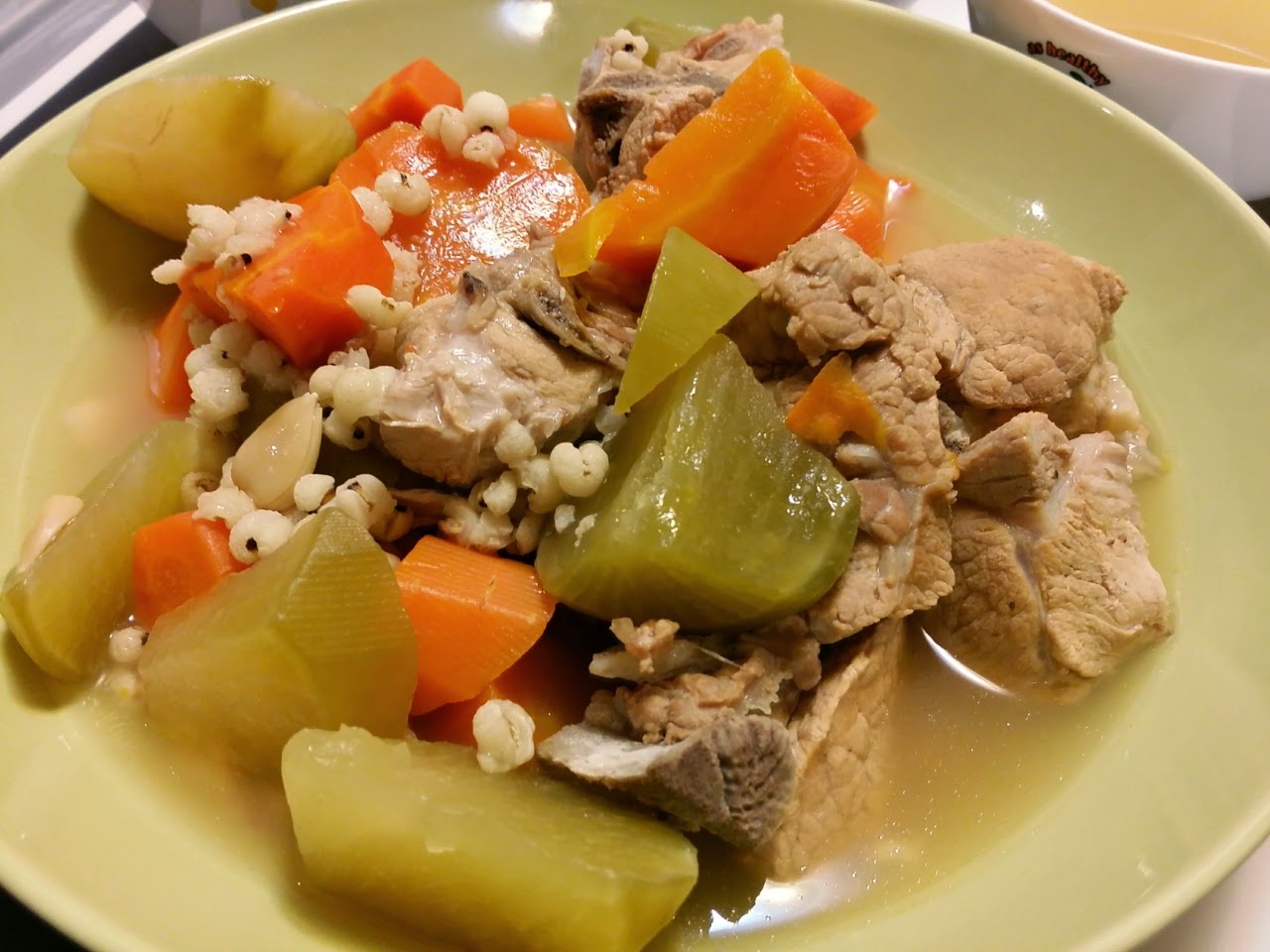 所以趁週日有時間就煲番個加了 "薏米" 袪濕湯飲吓, 加埋南北杏可以有止咳功效 (因早排感冒仍有幾聲咳), 紅青蘿蔔有滋潤功效. 煲出嚟湯水好清甜, I Like ar~