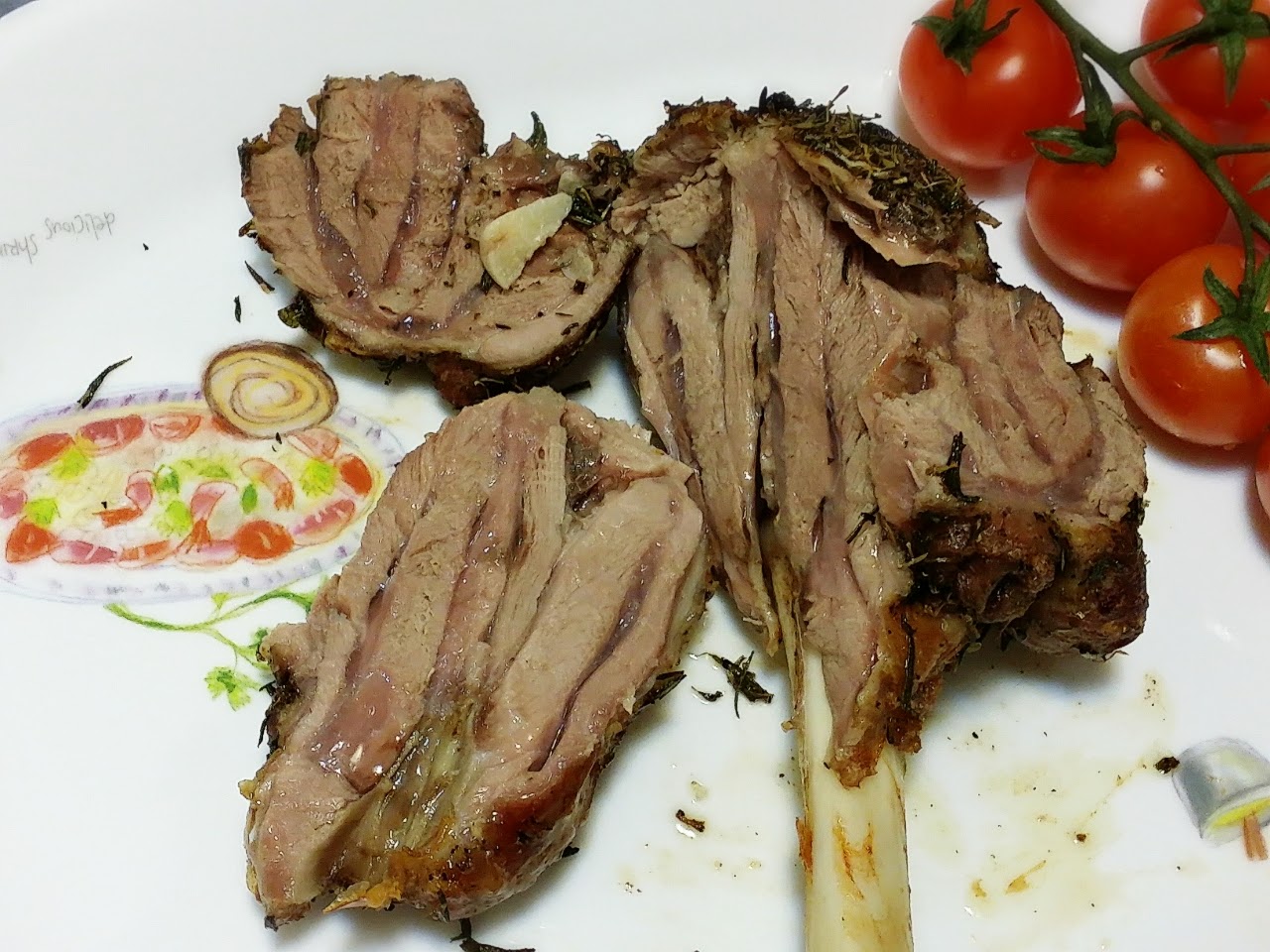 2) 預熱焗爐, 在焗盤中塗上橄欖油. 開火下油, 下羊膝煎封 5 分鐘左右. 然後將羊膝放入焗盤中, 入焗爐用 200 度火力焗 35 分鐘, 再用180 度火力焗 10 分鐘, 取出靜待 10 分鐘後就可食用了.